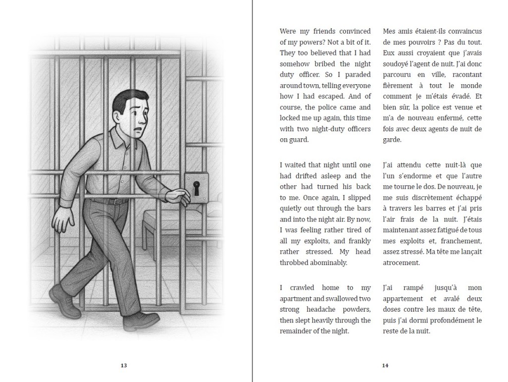 An illustrated tale of a man who gains the power to walk through walls, following an electric shock. At first simply puzzled by his new-found power, he teases his oppressive employer by making faces at him through the wall. Then he realizes he can become rich by quietly entering bank vaults at night. He boasts to his friends – who don’t believe him – so as proof, he boasts to the police and is jailed. But of course, he quietly escapes through the bars when no one is looking. Read on to discover how the tale ends…